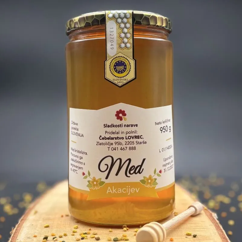 Na akacijevo pašo naše čebelice vozimo ob strugo reke Mure v Sodišince in Gederovce. Akacijev med, ki mu nekateri pravijo tudi damski med, je značilne svetlo rumene - zlate barve in je blagega okusa. Zaradi nežnega okusa je idealen, kot namaz za na kruh, sladkanje kave, čaja, kosmičev, jogurtov, skute itd. Otroci ga obožujejo. Kristalizira zelo počasi.