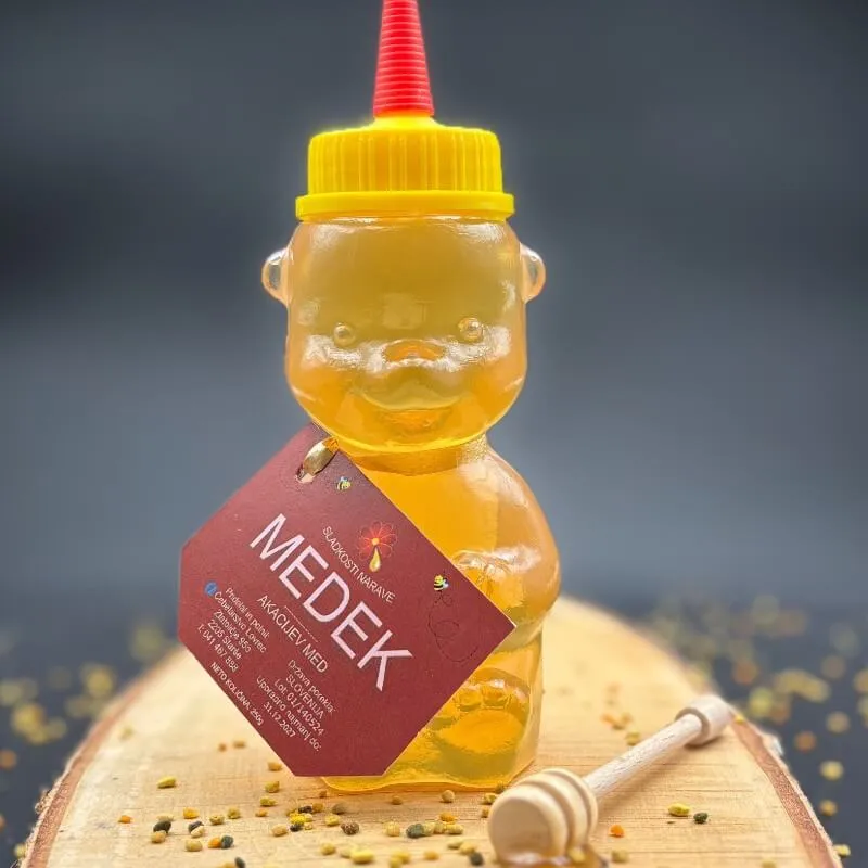 Akacijev med v priročni PVC embalaži. Medek ima pokrov za enostavno doziranje medu na kruh ali čaj. Tudi otrokom lahko na tak način približamo uporabo medu. Medek je namenjen za večkratno uporabo, ko ga izpraznite, lahko v medek nalijete nov med kupljen v kozarcu.